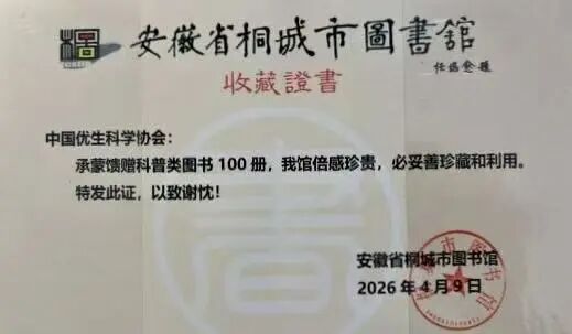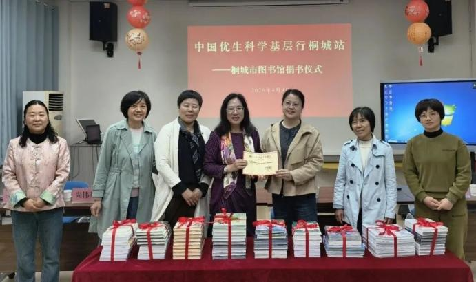 2026年4月9日,“优生科学基层行”捐书仪式和首场科普讲座在桐城市图书馆举行。活动由桐城市图书馆馆长吴苏琴主持,中国优生科学协会会长刘雯致辞。桐城市文化旅游体育局党组成员项并玉参加活动。活动现场,中国优生科学协会向桐城市图书馆捐赠科普图书100册。涵盖优生优育、妇幼保健、健康养生、儿童读物等多个领域,希望以优质科普书籍普及读者健康知识。桐城市图书馆馆长表示将设立健康科普专属阅览区,充分发挥图书资源价值,推动科学健康理念在桐城广泛传播。