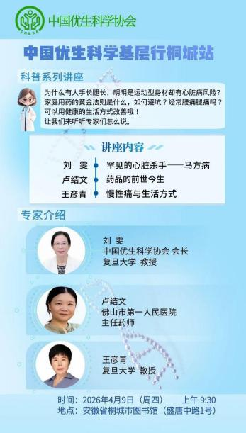 本次的“优生科学基层行”还邀请了知名专家为市民带来了高水平的专业科普讲座。刘雯教授的“罕见的心脏杀手——马方病”,以形象生动、趣味横生的讲授让听众对罕见疾病有了认识;复旦大学王彦青教授聚焦“远离慢性痛,呵护女性健康”开展科普分享,为守护女性自身健康,解决困扰女性的慢性问题带来了科学且实用的知识?。桐城站的活动,有讲座亦有咨询,为前来听讲的社区居民带来专业、实用的健康指导,受到群众的热烈欢迎。