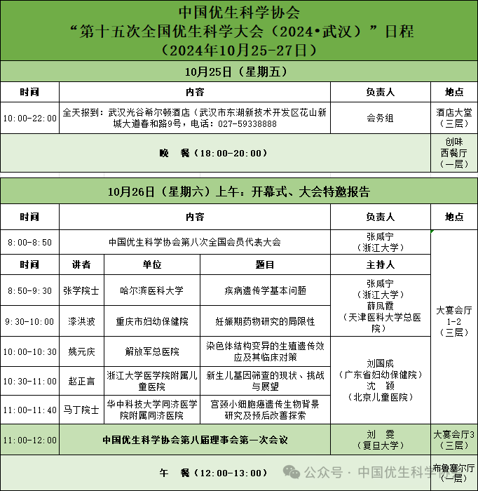 由中国优生科学协会主办,湖北省优生优育协会、华中科技大学同济医学院附属同济医院、湖北省妇幼保健院协办的第十五次全国优生科学大会(2024·中国优生科学)拟于2024年10月25-27日在湖北省武汉市召开。大会除邀请优生科学相关学科的著名专家作大会报告外,将设立多个涵盖优生科学领域的专业分会场,交流最新研究成果,探讨学科发展趋势。热忱欢迎全国各医院、高校、科研院所、企业的优生科学工作者参加!一、大会主题